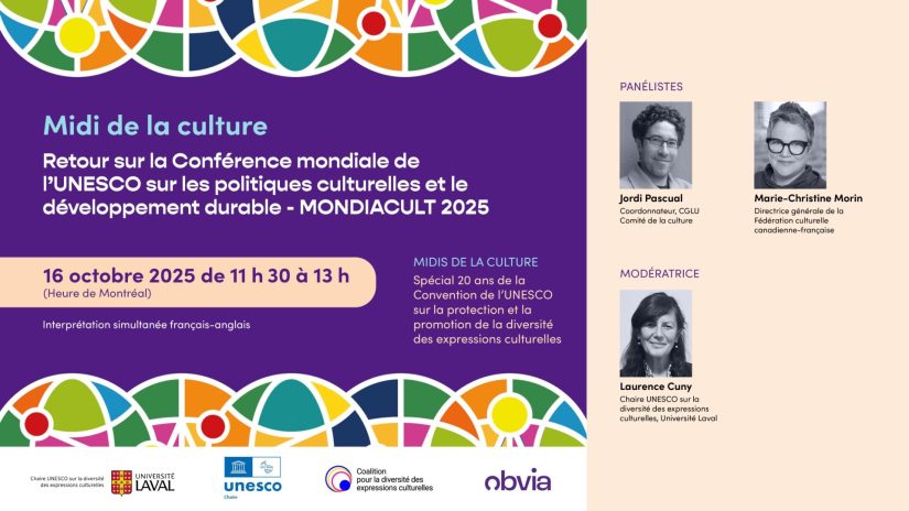 Le quatrième Midi de la culture, intitulé «Retour sur la Conférence mondiale de l’UNESCO sur les politiques culturelles et le développement durable – MONDIACULT 2025», réunira Marie-Christine Morin, directrice générale de la Fédération culturelle canadienne-française et Jordi Pascual, coordonnateur, CGLU Comité de la culture. L’événement sera animé par Laurence Cuny, membre de la Chaire UNESCO sur la diversité des expressions culturelles, Université Laval.