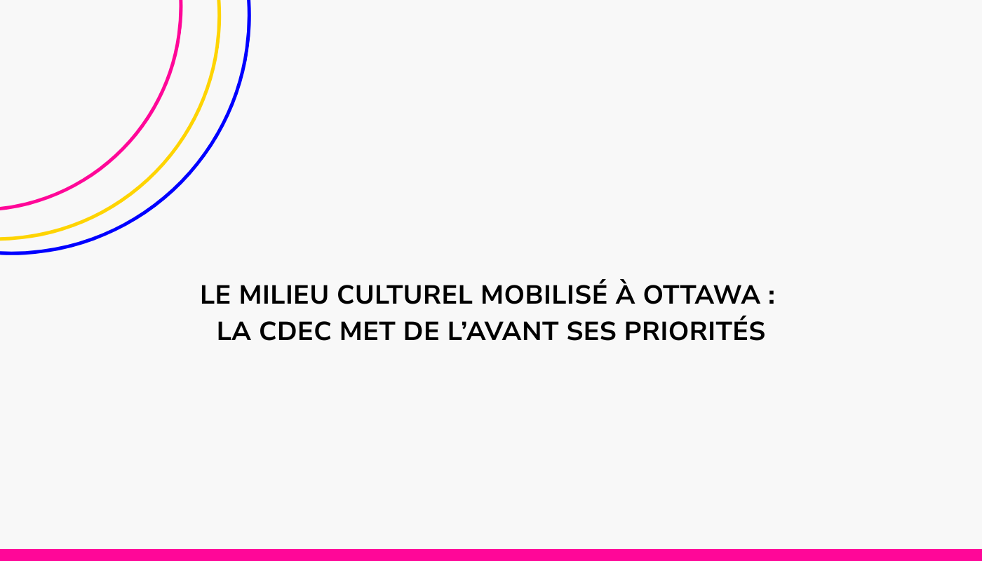 La Coalition pour la diversité des expressions culturelles (CDEC) dévoile aujourd’hui son document stratégique S’engager pour la souveraineté culturelle canadienne. Ce texte rassemble les enjeux prioritaires qui font consensus au sein du milieu culturel et il trace la voie pour des décisions ambitieuses de la part du gouvernement fédéral.